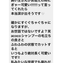 嬉しい口コミ頂きました️Acoco︎シャンプーを気にってくださりありがとうございます#個人的な感想ですAcoco︎シャンプーのコンセプトママと僕と私は同じ匂い。安心するね。わんちゃんも飼い主様もトリマー様もみんなHappyに♫♪♫ワンちゃん...
